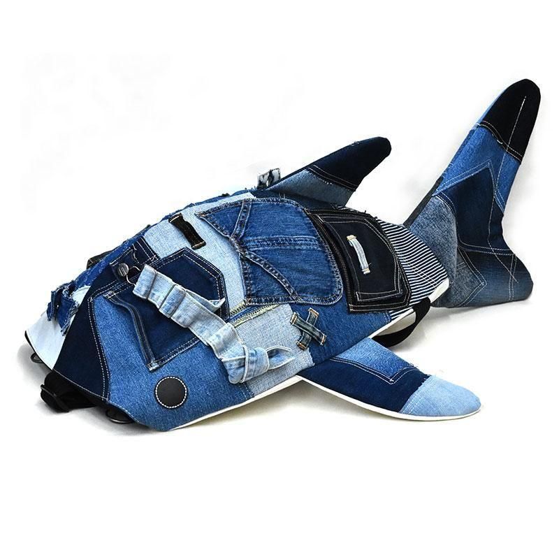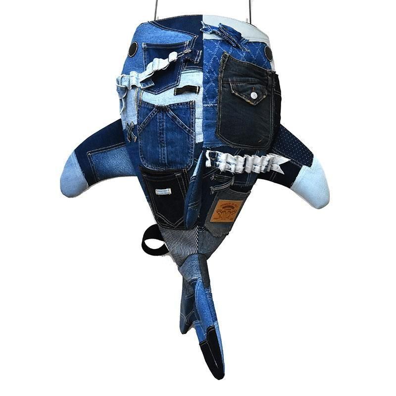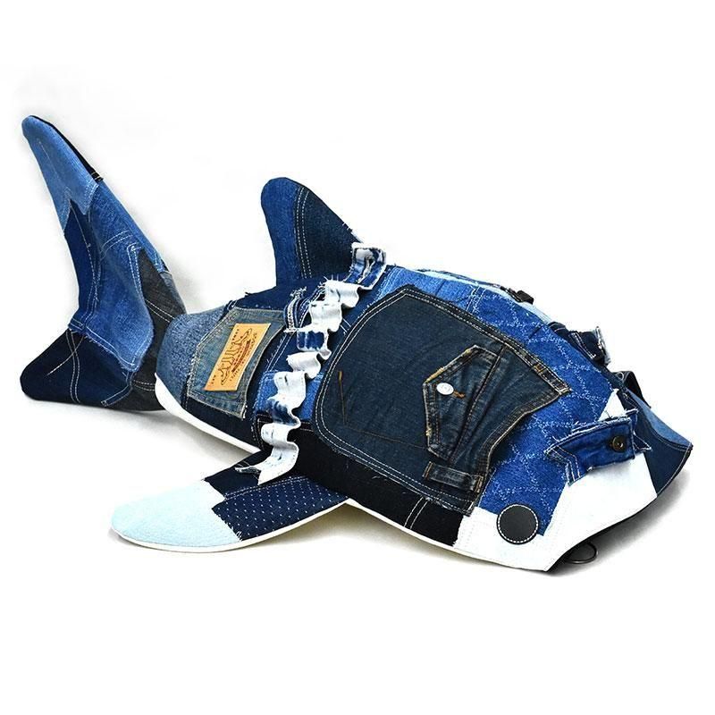 ユーズドジーンズを使いリメイクした、ジンベイザメの形がモチーフの斜め掛け巨大ボディバッグ「通称デカザメ」です。