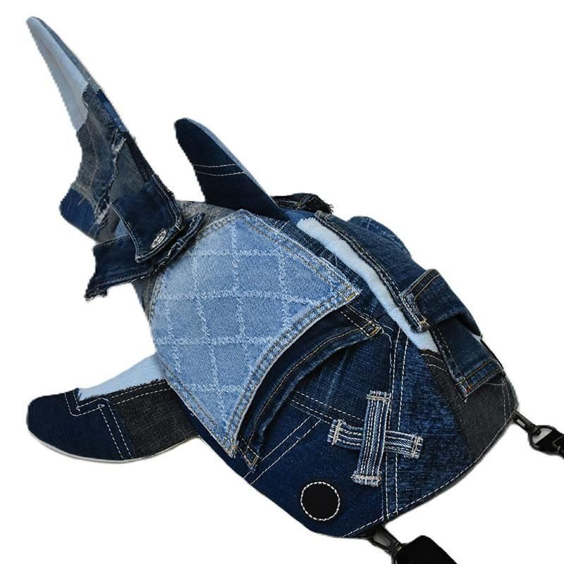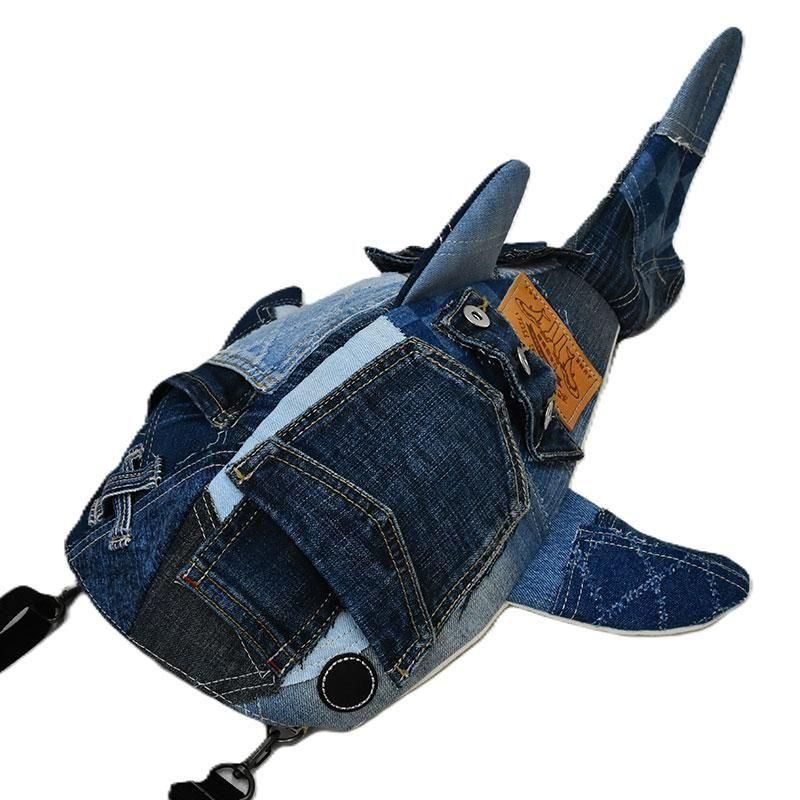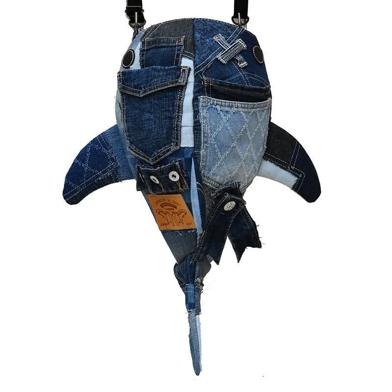 ユーズドジーンズを使ったジンベイザメの形をモチーフにしたショルダーバッグ「小サメ(ちいさめ)」です。